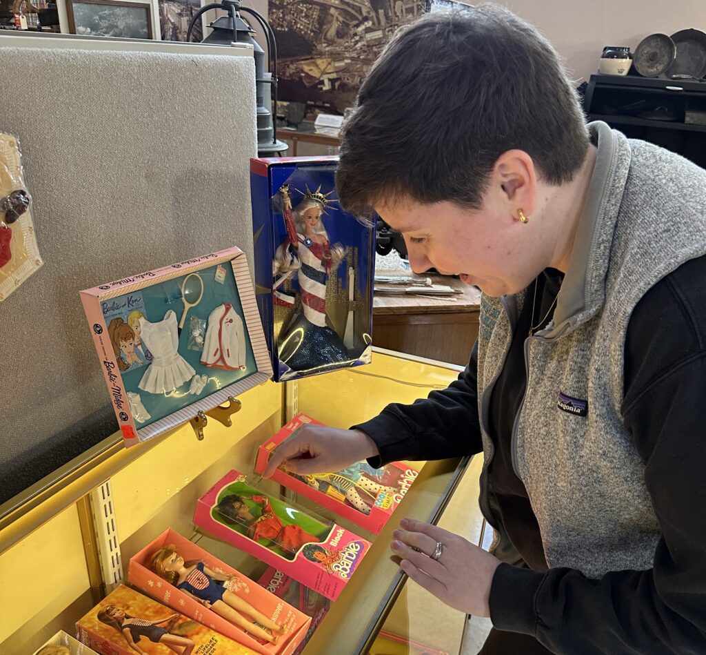 A highlight of the reopening is a new exhibit featuring selections from the museum’s extensive Barbie doll collection, originally donated as part of the Barbara Heriford Estate in 1991. The entire collection includes nearly 60 boxed dolls and 20 accessory sets. Items were carefully chosen to illustrate Barbie’s evolution over the decades.